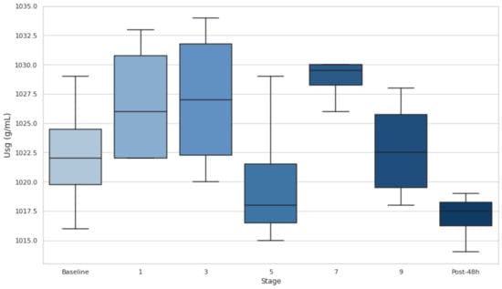 The first urine sample in the morning (baseline) and the first urine sample after stages 1, 3, 5, 7, and 9 were taken from all the participants. Samples were collected in polyethylene tubes, measured, codified, and frozen at −80 °C until analyzed. The tubes had been previously washed with diluted nitric acid. Before the analyses, samples were thawed and homogenized by shaking. For Usg analysis, a 10 mL urine sample was used to obtain each participant’s values. To achieve this aim, a pre-calibrated refractometer (URC-Ne, Atago, Tokyo, Japan) was employed in situ as previously described [].