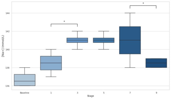Serum sodium at baseline, after stages 1, 3, 5, 7, and 9, and 48 h post-event. Hyponatremia threshold settled at <135 mmol·L−1. [Na+]: serum sodium; * p < 0.05.