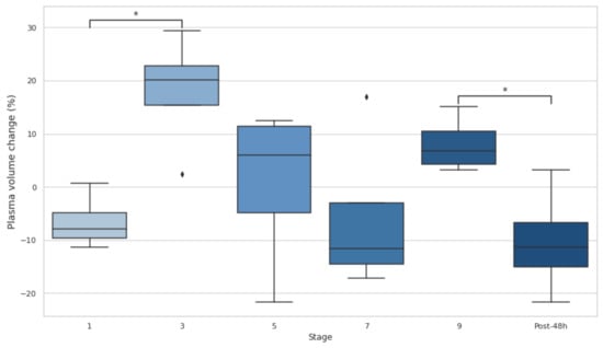 Plasma volume (%) at baseline, after stages 1, 3, 5, 7, and 9, and 48 h post-event. Post-48 h: 48 h post-event; * p < 0.05.