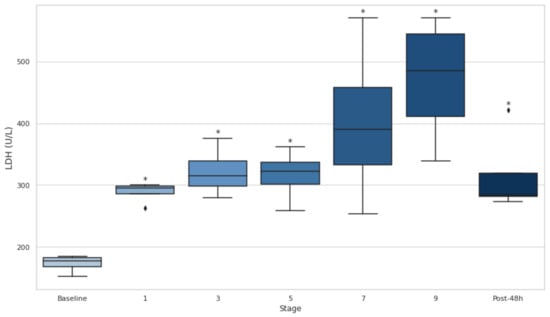 Serum lactate dehydrogenase at baseline, after stages 1, 3, 5, 7, and 9, and 48 h post-event. LDH: lactate dehydrogenase. Post-48 h: 48 h post-event; * p < 0.05.