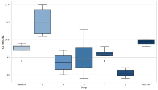 Serum Ca levels significantly increased at the end of stage 1 compared to the baseline (p < 0.05, d = −2.29) but remained below the baseline during the intermediate stages, with no significant changes observed in stages 3, 5, or 7 (Figure 6). At the end of stage 9, Ca exhibited a significant decrease compared to the baseline (p < 0.05, d = 3.72). (Figure 7).