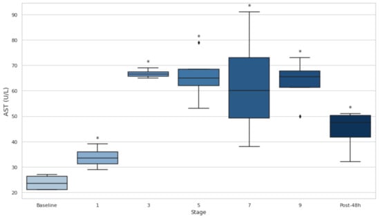 Serum aspartate aminotransferase at baseline, after stages 1, 3, 5, 7, 9 and 48 h post-event. AST: aspartate aminotransferase. Post-48 h: 48 h post-event; * p < 0.05.