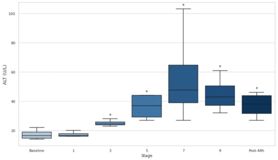 Serum alanine aminotransferase at baseline, after stages 1, 3, 5, 7, and 9, and 48 h post-event. ALT: alanine aminotransferase. Post-48 h: 48 h post-event; * p < 0.05.