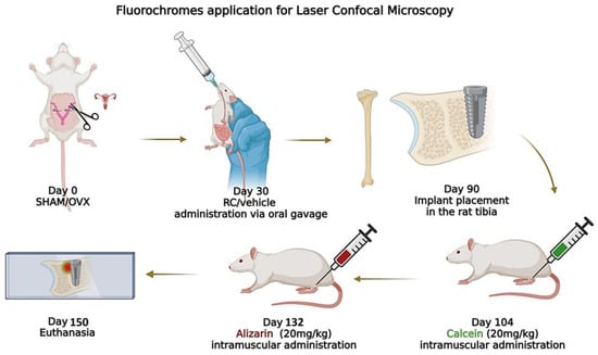 After 14 days of implant installation, the animals were given an intramuscular injection of calcein (20 mg/kg). Then, 42 days after the implant installation, the same animals received an intramuscular injection of alizarin red (20 mg/kg). The fluorochromes act by binding to minerals in the bone matrix. This labeling measured bone mineral precipitation. The first fluorochrome received indicates an older bone, while the second indicates a new bone, as referred to in an earlier study []. The timeline for the application of fluorochromes is shown in Figure 1.