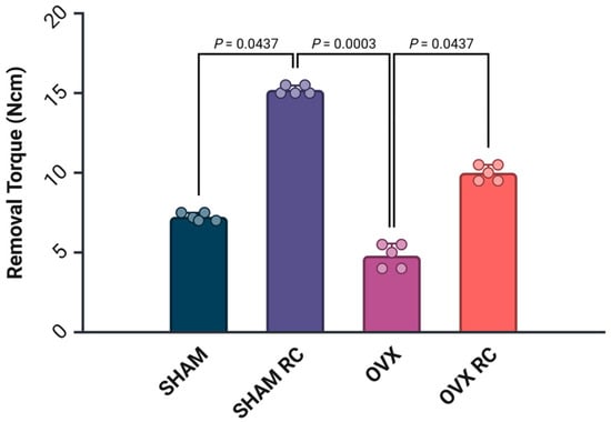 Biomechanical analysis of removal torque. The dot–bar graph shows the mean results, and the error bars indicate the standard deviation for the removal torque value from experimental groups followed by SHAM, SHAM/RC, OVX, and OVX/RC at 60 days after implantation. The p < 0.05 indicates statistical differences among the groups.