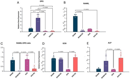 Molecular analysis for each gene expression (A–E). The dot–bar graph shows the mean results, and the error bars indicate the standard deviation for relative gene expression from the real-time PCR in peri-implant bone healing from the SHAM, SHAM/RC, OVX, and OVX/RC groups after 60 days of implantation. In RT-PCR, the genes evaluated were OPG, RANKL, OCN, and ALP. p < 0.05 indicates statistical differences between the groups.