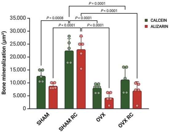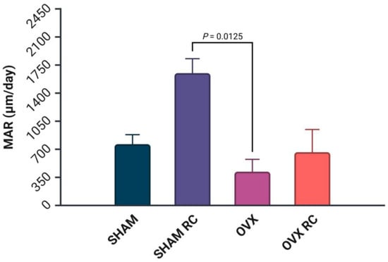The MAR values are reported in micrometers per day (µm/day) in Figure 5. The results show that SHAM/RC had the highest MAR (1515 µm/day), followed by SHAM (850 µm/day), OVX/RC (698 µm/day), and OVX (400 µm/day). A significant statistical difference was observed between the SHAM/RC and OVX groups (p < 0.05) (see Figure 6).