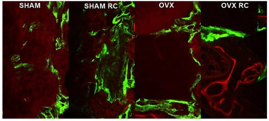 Bone dynamics. A representative image of bone dynamics formed by overlapping the fluorochromes of calcein and alizarin in the peri-implant bone of the tibia in each group for the SHAM, SHAM/RC, OVX, and OVX/RC groups after 60 days of implantation using to ImageJ software (version 1.52v, National Institutes of Health, Bethesda, MD, USA).