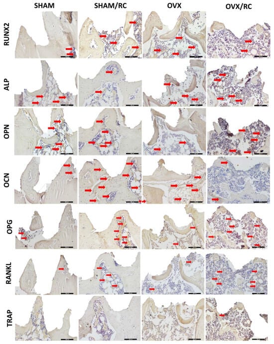 Immunolabeling in peri-implant bone healing for the SHAM, SHAM/RC, OVX, and OVX/RC groups after 60 days of implantation. The red arrows indicate positive immunostaining for the proteins Runx2, ALP, OPN, OCN, OPG, RANKL, and TRAP. Scale bar = 100 µm. Original magnification: 20×.