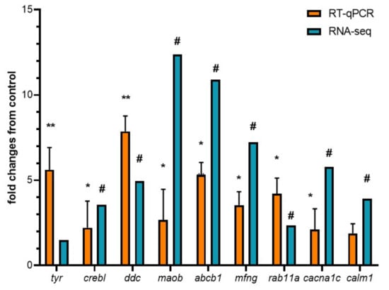 Validation of RNA sequencing by real-time PCR of DETs. The following DETs were selected to validate RNA-seq by real-time PCR: tyr, crebl, ddc, maob, abcb1, mfng, rab11a, cacna1, calm1. For RNA-seq, in blue, “#” indicates a log2 fold change ≥2.0 and FDR <0.05. For RT-qPCR, in orange, relative expression was normalized against fau and actβ. Fold change from control indicates the relation between dark edge transcript expression and white edge transcript expression. The results are expressed as means and + standard errors (n = 3 per group). Differences between DME and WME groups are shown in * p < 0.05, and ** p < 0.01.