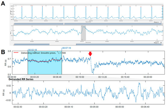 (A) Example of electrocardiogram recording with beat identification. Below is the RR interval with the trace where the previous electrocardiogram was taken, indicated by a gray rectangle. (B) Recorded RR intervals (over 20 min in length). In the first 10 min (supine position), the heart rate is lower, and the range of RR intervals is between 900 and 1100 ms. Starting at minute 10 (change to active standing), the heart rate is faster: RR intervals range between 700 and 900 ms. The blue rectangle marks the location of the measurement (a 5 min segment), and the red line inside shows the detrending line. Below is the detrended RR time series.