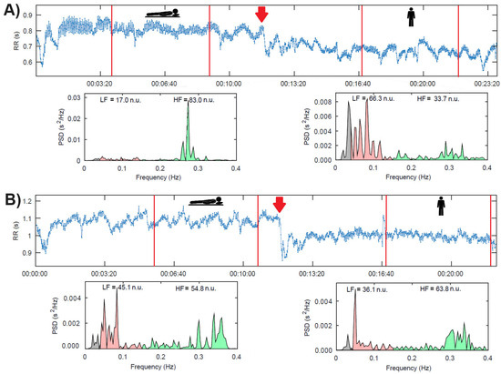 (A). Patient with sympathetic predominance in response to active standing. (B). Patient without sympathetic predominance in response to active standing. The red arrows indicate the change to an active standing position. The red lines indicate the limits of each selected interval in each position.