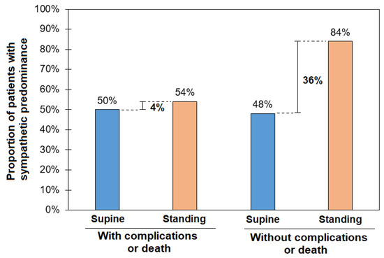 Figure 3 shows the relationship between dorsal recumbency and orthostatic challenge in patients divided by the presence of the outcome. In patients with the outcome, sympathetic activity does not have a compensation phase with the orthostatic challenge (50% vs. 54%), i.e., they had poor sympathetic compensation with a large proportion of patients without sympathetic predominance while standing. Meanwhile, patients who did not have the outcome showed that they still had a wide range of sympathetic responses to the orthostatic challenge (48% vs. 84%).