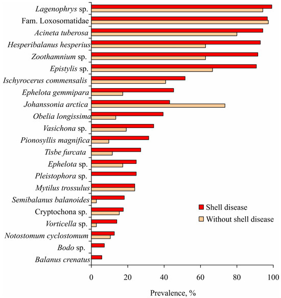 Prevalence of symbionts on shell disease and healthy red king crabs in the Sea of Okhotsk (adopted from [60]).