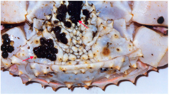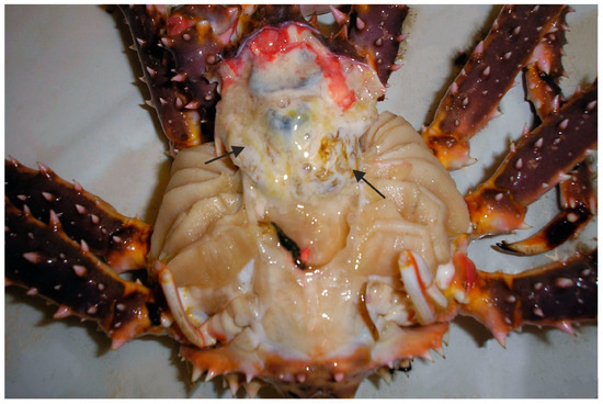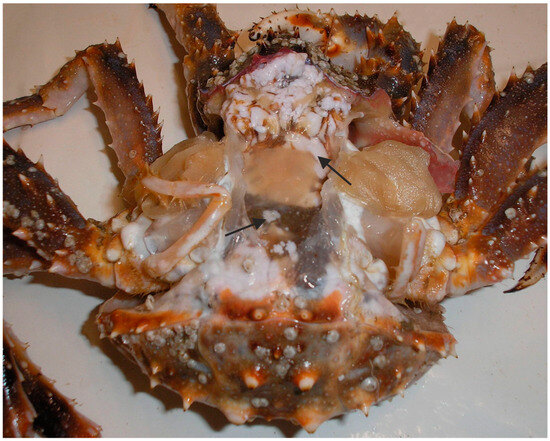 Red king crab infected with the microsporidian Thelohania sp. Arrows show infected tissues (adopted from [57,60]).