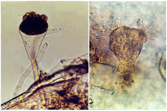 Suctorians Ephelota sp. (left) and Acineta tuberosa (right) on the gills of a red king crab from the Sea of Okhotsk. × 100 magnification (modified from [60]).