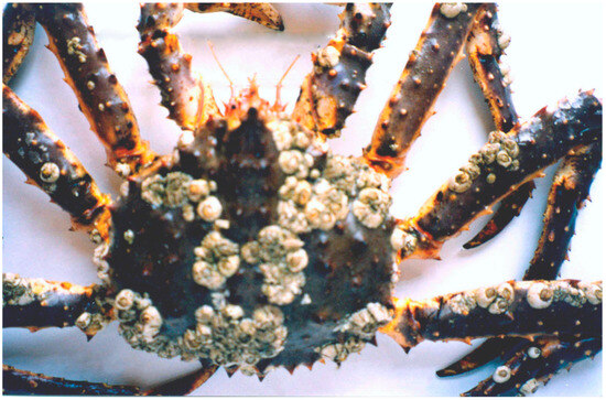 Barnacles Hesperibalanus hesperius and Semibalanus balanoides on the carapace and limbs of a red king crab from the Sea of Okhotsk (modified from [60]).