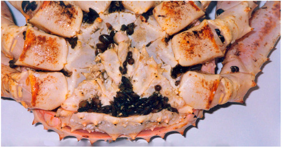 Johanssonia arctica was also recorded on red king crabs in the Barents Sea with the same localization, albeit with lower infestation indices [44,46,47,126]. Fish leeches are commensals that utilize their crustacean hosts for egg deposition [127].