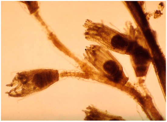 Hydrozoans Obelia longissima and Sertularia cupressoides typically colonized the carapace (Figure 9) and limbs with annual prevalences of 20.0–52.5% and 11.7%, respectively [60].