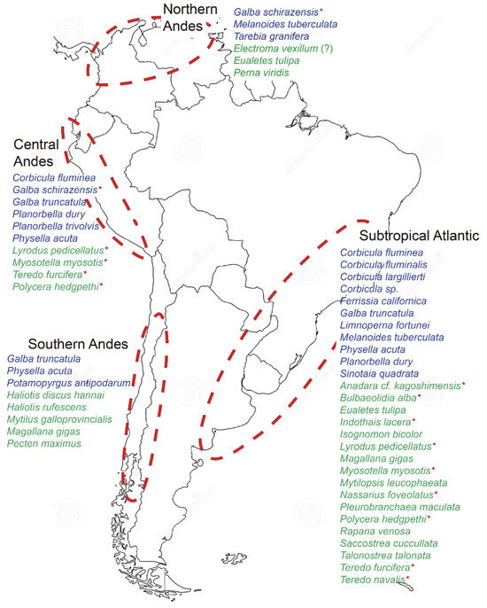 - Darrigran, G.; Agudo-Padrón, I.; Baez, P.; Belz, C.; Cardoso, F.; Collado, G.A.; Correoso, M.; Cuezzo, M.G.; Damborenea, C.; Fabres, A.A.; et al. Species movements within biogeographic regions: Exploring the distribution of transplanted mollusc species in South America. Biol. Invasions 2023, 25, 673–691. [Google Scholar] [CrossRef]