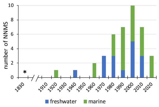 Aquatic NNMS introduced in South America by date (10-year interval), and according to habitat (marine and freshwater). The first recorded NNMS (*) corresponds to a terrestrial species recorded in 1835; the first aquatic NNMS was recorded in the 1920s.