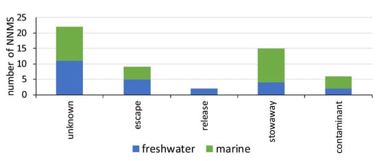 - Faulkner, K.T.; Hulme, P.E.; Pagad, S.; Wilson, J.R.U.; Robertson, M.P. Classifying the introduction pathways of alien species: Are we moving in the right direction? NeoBiota 2020, 62, 143–159. [Google Scholar] [CrossRef]