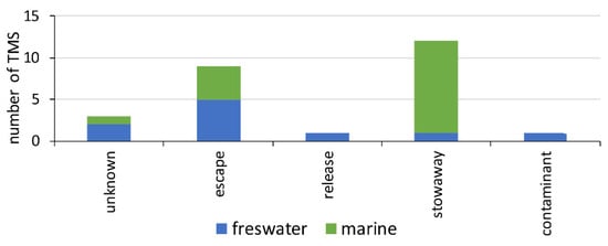 The environmental, economic, and social impacts of transplantation are comparable to those associated with the introduction and establishment of non-native species. The analysis indicates that the most common pathway for transplantation is as stowaways, particularly for bivalves, while escape is a frequent pathway for freshwater species. In South America, TMS transport routes are often linked to economic activities, such as aquaculture and the ornamental species trade [17,76] (Figure 4).