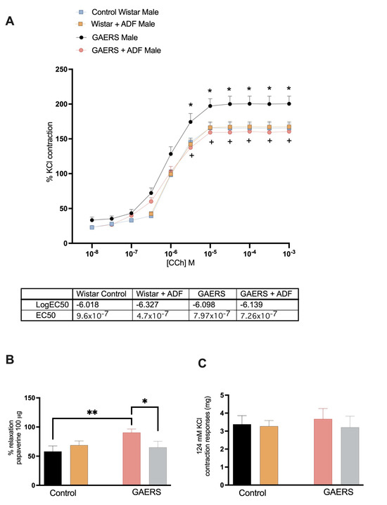 The effects of ADF on bladder function in GAERS were assessed using in vitro bladder contraction–relaxation responses in male and female rats. The contraction–relaxation reactions obtained from the bladder tissue of the female rats showed no significant differences between the groups (Table S1). The results, including comparisons between the male control and GAERS rats under normal diet and ADF conditions, are presented in Figure 1.