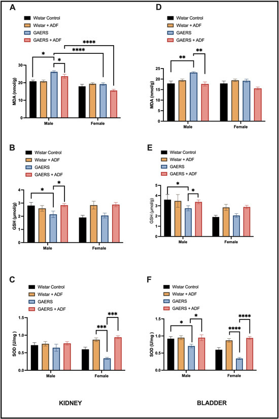 The effects of ADF (alternate-day fasting) on oxidative stress markers in the kidney tissues of the experimental groups were assessed by comparing MDA, GSH, and SOD levels (Figure 2A–C). In the kidney, MDA levels were significantly higher in the male GAERS rats compared to the Wistar controls (p < 0.05), indicating increased lipid peroxidation and oxidative damage. ADF significantly reduced MDA levels in the male GAERS rats (p < 0.05), demonstrating its protective effect. No significant differences were observed between the female groups. Glutathione (GSH) levels were significantly reduced in the male GAERS rats compared to the Wistar controls (p < 0.05), indicating impaired antioxidant capacity. ADF improved GSH levels in the male GAERS rats (p < 0.05), suggesting a potential reversal of oxidative stress. In the female groups, GSH levels significantly increased with both Wistar ADF and GAERS ADF interventions (p < 0.05). Superoxide dismutase (SOD) activity (Figure 2C) showed a marked decrease in the female GAERS rats compared to the Wistar controls (p < 0.001). ADF significantly increased SOD levels in the female GAERS rats (p < 0.001), highlighting its potential in restoring antioxidant enzyme activity. The effects of ADF on oxidative stress markers in the bladder tissues of the experimental groups were assessed by comparing MDA, GSH, and SOD levels (Figure 2D–F). In the bladder, MDA levels, an indicator of lipid peroxidation, were significantly higher in the male GAERS rats than in Wistar control rats (p < 0.01). ADF intervention reduced MDA levels in the male GAERS rats (p < 0.01). GSH levels, similar to the trend observed in the kidney, showed a significant improvement in both the male and female GAERS rats after ADF intervention (p < 0.05). SOD activity, an important enzymatic antioxidant defense, was significantly lower in both the male and female GAERS rats (p < 0.05, p < 0.0001, respectively). However, ADF significantly enhanced SOD activity in both sexes (p < 0.05 in males, p < 0.0001 in females).
