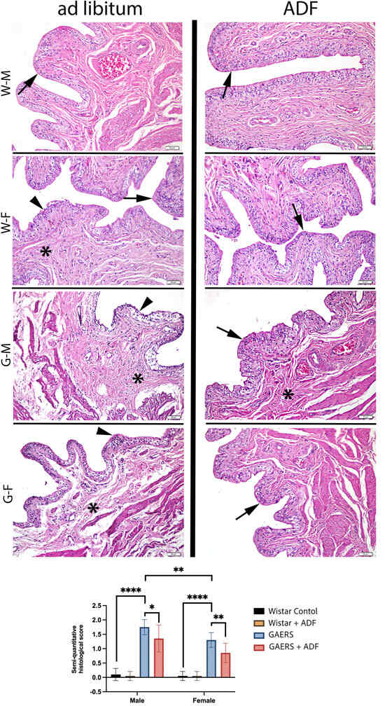 Representative micrographs of bladder tissues from all experimental groups and the graphics of statistical analyses of semi-quantitative histopathological scoring. Arrow: urothelium with regular appearance, arrowhead: irregular urothelium, asterisk: edema in connective tissue and thin muscle bundles. WF: Wistar female. WM: Wistar male. GF: GAERS female. GM: GAERS male. Ad libitum: normal diet. ADF: alternative day fasting. Hematoxylin and eosin staining. Bars: 50 µm (*: p < 0.05, **: p < 0.01, ****: p < 0.0001).