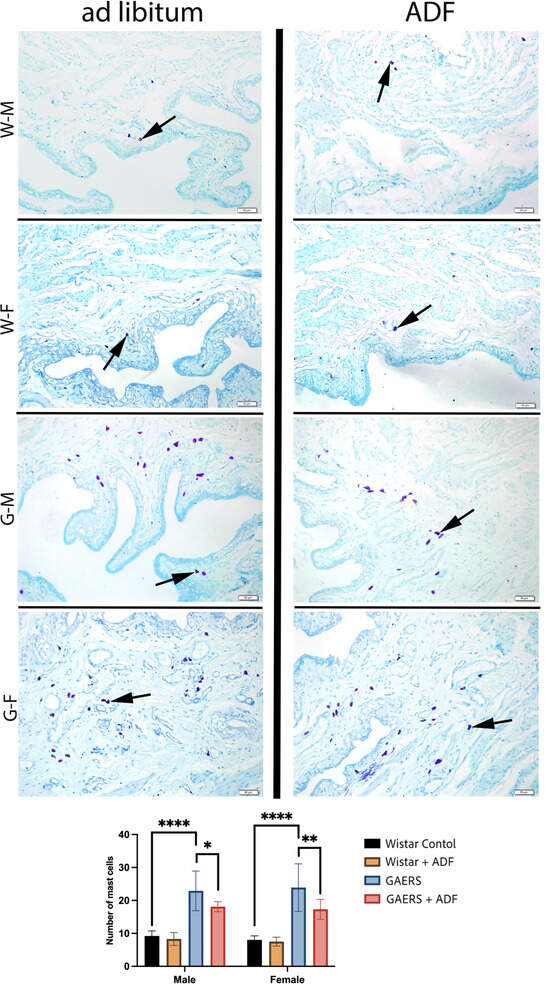 Representative micrographs of bladder tissues from all experimental groups and the graphics of statistical analyses of the mast cell counting. Arrow: mast cell. WF: Wistar female. WM: Wistar male. GF: GAERS female. GM: GAERS male. Ad libitum: normal diet. ADF: alternative day fasting. Toluidine blue staining. Bars: 50 µm (*: p < 0.05, **: p < 0.01, ****: p < 0.0001).