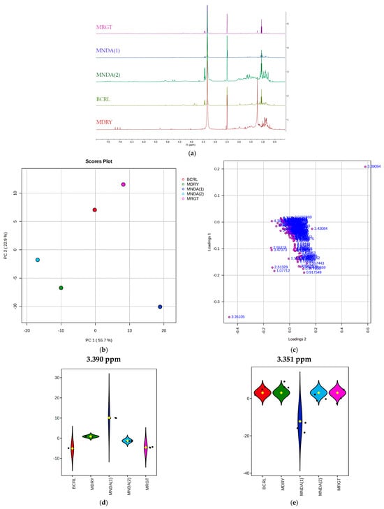 Spectral profiles and chemometric analysis of geopropolis extracts. (a) One-dimensional 1H NMR spectra of geopropolis extracts; (b) Principal Component Analysis (PCA) plot, showing the grouping of extracts based on their chemical profiles; (c) loadings plot highlighting the spectral regions (0.04 ppm buckets) that contribute most significantly to the differentiation of geopropolis extracts; (d,e) key spectral regions in the lower left (3.351 ppm) and upper right (3.390 ppm) identified as the primary contributors to the extracts’ discrimination. BCLR: geopropolis extract from Melipona bicolor; MDRY: geopropolis extract from M. mondury; MNDA(1): geopropolis extract from M. quadrifasciata; MNDA(2): geopropolis extract from M. quadrifasciata; MRGT: geopropolis extract from M. marginata.