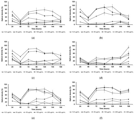The growth curves of promastigotes treated with geopropolis extracts and the reference drug were monitored over 168 h to distinguish between leishmanistatic and leishmanicidal effects (Figure 2). At the 48 h mark, all extracts inhibited cell growth, but their effects diverged thereafter, showing distinct patterns. The MNDA(1) extract exhibited a leishmanicidal effect at 50 to 400 µg/mL concentrations, while growth was noted at 25 and 12.5 µg/mL concentrations after 48 h of treatment (leishmanistatic effect). The growth profile was similar when the parasites were treated with the BCLR and MNDA(1). MRGT displayed a leishmanicidal effect at 200 and 400 µg/mL. At a 100 µg/mL concentration, slight cell growth was observed between 72 and 144 h, followed by a decline at 168 h of treatment. MDRY showed a leishmanicidal effect at 100 to 400 µg/mL concentrations, inhibiting cell growth, while the other tested concentrations were leishmanistatic. The MNDA(2) extract had the greatest effect on cell growth among the extracts, as growth remained below 50% after 144 h. This extract displayed a leishmanicidal effect at 100 to 400 µg/mL. At 50 µg/mL, a leishmanistatic effect was observed from 96 h, while the other concentrations showed this effect starting at 48 h. SbIII exhibited a leishmanicidal effect at 200 and 400 µg/mL, while cell growth was observed between 12.5 and 50 µg/mL after the 48 h mark.