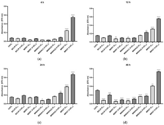 The effects of treatment with geopropolis extracts on mitochondrial dehydrogenases in L. amazonensis promastigotes after treatment with the extracts at concentrations corresponding to the IC50 and 2×(IC50). (a) Parasites treated with geopropolis extracts for 4 h; (b) Parasites treated with geopropolis extracts for 12 h; (c) Parasites treated with geopropolis extracts for 24 h; and (d) Parasites treated with geopropolis extracts for 48 h. CNTL: negative control (untreated); BCLR: geopropolis extract from Melipona bicolor; MDRY: geopropolis extract from M. mondury; MNDA(1): geopropolis extract from M. quadrifasciata; MNDA(2): geopropolis extract from M. quadrifasciata; MRGT: geopropolis extract from M. marginata. The bars in the graphs represent the mean values derived from two independent experiments, each performed in triplicate. Statistical analysis was performed using one-way ANOVA followed by Tukey’s post-test, comparing each treatment group with the control (untreated cultures). Significance levels are denoted as follows: * p < 0.05, ** p < 0.01, *** p < 0.001 and **** p < 0.0001.