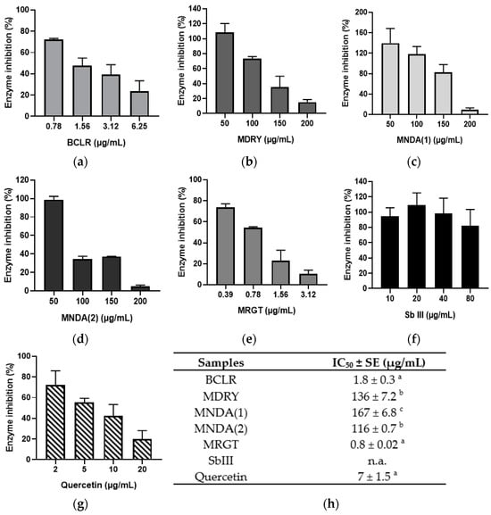LiARG inhibition activity of geopropolis extracts. Concentration–response bar graph of enzyme inhibition by (a) BCLR; (b) MDRY; (c) MNDA(1); (d) MNDA(2); (e) MRGT; (f) SbIII; and (g) quercetin. (h) Half-maximum enzyme inhibition activities of geopropolis extracts, SbIII, and quercetin. BCLR: geopropolis extract from Melipona bicolor; MDRY: geopropolis extract from M. mondury; MNDA(1): geopropolis extract from M. quadrifasciata; MNDA(2): geopropolis extract from M. quadrifasciata; MRGT: geopropolis extract from M. marginata; SbIII: antimony potassium tartrate trihydrate; n.a.: not active. The bars in the graphs and the values in the table represent the mean values ± standard error obtained from three independent experiments, with each experiment being conducted in triplicate. Different letters in (h) indicate significant differences (p < 0.05) between samples through statistical analysis using one-way ANOVA with Tukey’s multiple-comparisons test.