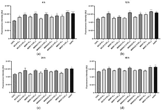 Effect of geopropolis treatment on intracellular ROS production in L. amazonensis. Promastigotes were treated with IC50 or 2×IC50 concentrations of each extract or with AAPH (1 mM) as a control. (a) Parasites treated with geopropolis extracts for 4 h; (b) Parasites treated with geopropolis extracts for 12 h; (c) Parasites treated with geopropolis extracts for 24 h; and (d) Parasites treated with geopropolis extracts for 48 h. CNTL: negative control (untreated); BCLR: geopropolis extract from Melipona bicolor; MDRY: geopropolis extract from M. mondury; MNDA(1): geopropolis extract from M. quadrifasciata; MNDA(2): geopropolis extract from M. quadrifasciata; MRGT: geopropolis extract from M. marginata; AAPH: Parasites exposed to 2,2′-azobis(2-methylpropionamidine) dihydrochloride (oxidative stress inducer). The bars in the graphs represent the mean values obtained from two independent experiments, with each experiment conducted in triplicate. Statistical analysis was performed using one-way ANOVA followed by Tukey’s post-test, comparing each treatment group with the control (untreated cultures). Significance levels are denoted as follows: * p < 0.05, ** p < 0.01, *** p < 0.001, and **** p < 0.0001.
