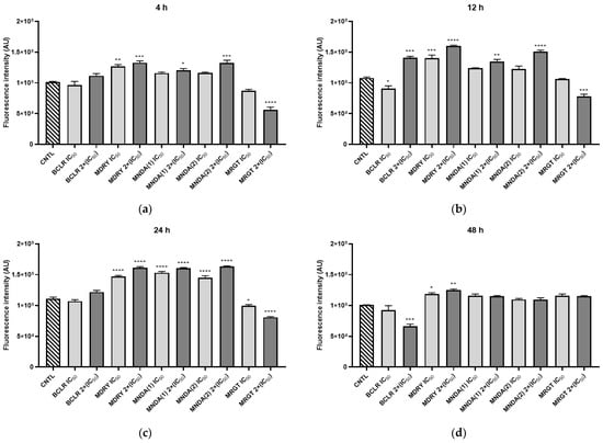 Intracellular ROS production was determined after promastigote treatment with different geopropolis extracts at concentrations of IC50 and 2×(IC50) (Figure 5). At the fourth hour of incubation, ROS production increased for all systems tested compared to the control (untreated cells), except for MNDA(1) IC50. Notably, the highest induction of ROS was observed when the parasites were treated with 2×(IC50) extracts. At the 12 h mark, the highest induction of ROS was only observed at the extracts’ 2×(IC50) concentration. The exception was the MRGT extract, which, at IC50 concentration, was able to induce ROS with a significant difference (p < 0.05) from the untreated control. No significant statistical difference was observed between the extracts and the positive control (AAPH) on parasite oxidative stress. This result suggests that the extracts were as effective as AAPH in generating oxidative stress in the parasites. At 24 h, all concentrations of the tested extracts induced ROS compared to the untreated control. Finally, at 48 h, 2×(IC50) concentrations of BCRL, MNDA(2), and MRGT significantly induced ROS (p < 0.05) compared to the untreated parasites and similarly to AAPH.