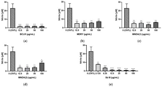 Effects of geopropolis extract treatment on non-infected peritoneal macrophages. (a) BCLR: geopropolis extract from Melipona bicolor; (b) MDRY: geopropolis extract from M. mondury; (c) MNDA(1): geopropolis extract from M. quadrifasciata; (d) MNDA(2): geopropolis extract from M. quadrifasciata; (e) Sb III: antimony potassium tartrate trihydrate. The bars in the graphs represent the mean values obtained from two independent experiments, with each experiment conducted in duplicate. Statistical analysis was performed using one-way ANOVA followed by Tukey’s post-test, comparing each treatment group with the control (untreated cultures). Significance levels are as follows: * p < 0.05, ** p < 0.01, *** p < 0.001, and **** p < 0.0001.