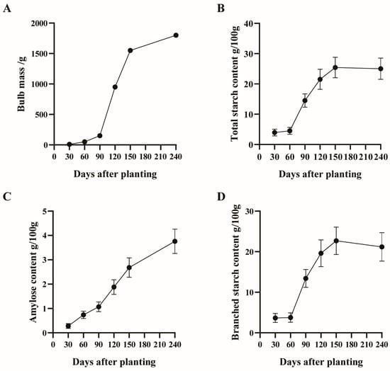 During the critical developmental phase of 120 to 150 days, a marked upsurge in both starch content and corm weight is observed, indicating that this period is a key phase for starch accumulation. Between 90 to 120 days, while the total starch content increased notably by 6.5 g/100 g of corm, the incremental increase in amylose content was comparatively modest, increasing by 0.21 g/100 g of corm. In contrast, the amylopectin content surged dramatically from 3.67 g/100 g of corm to 13.4 g/100 g of corm, suggesting that the rate of amylopectin accumulation surpassed that of amylose during this interval (refer to Figure 2 and Supplementary Table S2).