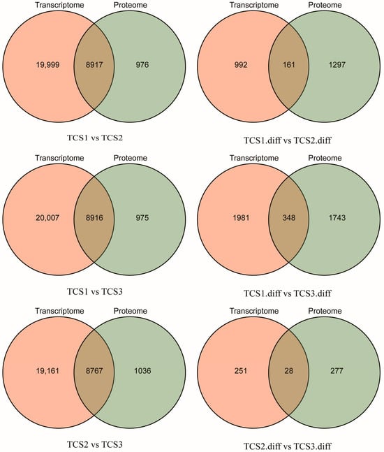 We performed a differential expression analysis of the transcripts and proteins at three critical time points (TCS1, TCS2, and TCS3) during taro corm expansion. The “pairwise comparison” results of the annotated transcripts and proteins from transcriptomics and proteomics at these time points are displayed in a Venn diagram (left side of Figure 3), alongside the results for differentially expressed transcripts and proteins (right side of Figure 3). These findings indicate significant variations in the expression levels of transcripts and proteins across different developmental stages, which are potentially linked to corm development and starch accumulation processes.