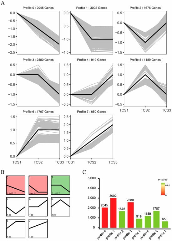 Trend pattern and number of trend genes. (A) Trend Pattern Diagram. This diagram visualizes gene trends, with black lines representing trend lines and gray lines representing individual genes. Gene data were normalized based on these trends. (B) Trend Pattern Diagram by p-Value. Red indicates significant differences, and green indicates non-significant differences. (C) Bar chart describing the number of trend genes. Heights of columns on graph represent the number of genes, and colors of columns represents the p-value. Note: In transcriptome trend analysis, profile 0 to profile 7 represent different gene expression trend patterns. Profile 0 indicates stable gene expression levels; profile 1 shows an increase followed by stability in expression levels; profile 2 is a decrease followed by stability in expression levels; profile 3 is characterized by an initial increase followed by a decrease in expression levels; profile 4 is a decrease followed by an increase in expression levels; profile 5 refers to a continuous increase in expression levels; profile 6 is a continuous decrease in expression levels; and profile 7 represents initial stability followed by an increase in expression levels.