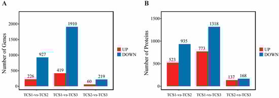 Analysis of DETs. Histogram of DET was obtained by comparing the transcriptome and proteome data of TCS1 with TCS2, TCS1 with TCS3, and TCS2 with TCS3. (A) Statistical chart of differentially expressed genes; (B) Statistical chart of differentially expressed proteins.
