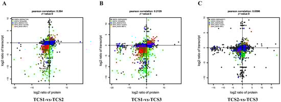 Four-quadrant diagram. (A) Four-quadrant analysis of transcriptome-proteome correlations between TCS1 and TCS2; (B) Four-quadrant analysis of transcriptome-proteome correlations between TCS1 and TCS3; (C) Four-quadrant analysis of transcriptome-proteome correlations between TCS2 and TCS3. In this diagram, the horizontal axis represents the protein differential multiple (log2 scale), while the vertical axis represents the transcriptome differential multiple (also log2 scale). The correlation coefficient and p-value between the transcriptome and proteome are shown at the top of the graph. Each point represents a gene/protein, with different colors indicating different expression patterns: black for non-differential proteins and genes, green for gene differential expression with protein non-differential expression, blue for protein differential expression with gene non-differential expression, red for both differentially expressed genes and proteins with consistent trends (i.e., either both upregulated or both downregulated), and yellow for both differentially expressed genes and proteins with opposite trends (i.e., one upregulated and the other downregulated).