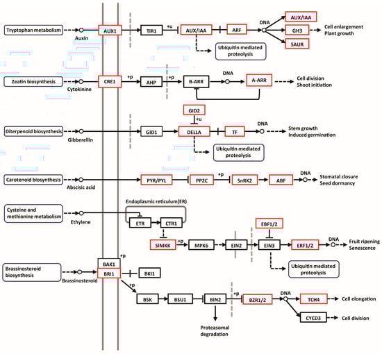 Hormonal signaling pathways in taro corm development. This figure provides a comprehensive overview of the hormonal signaling cascades that govern the development of taro corms. Each pathway is characterized by specific hormones, their cognate receptors, intracellular signal transduction molecules, and the resultant biological outcomes. The receptors within these pathways, upon hormone binding, modulate the activity of downstream transcription factors through phosphorylation (denoted by “+P”), subsequently affecting gene expression profiles. Genes and proteins that exhibit upregulated expression are highlighted within red boxes. Dashed arrows denote the regulatory influence of ubiquitin-mediated proteolysis on these signaling pathways. The two parallel long vertical lines (in gray) in the figure represent the cell membrane, with the left side indicating the extracellular environment and the right side indicating the intracellular signaling process. Short vertical solid lines (in gray) indicate that the protein is cleaved. For instance, when ethylene binds to its receptor, the receptor’s phosphorylation level decreases, and the activity of CTR1 is inhibited, thereby relieving the inhibition of EIN2. Subsequently, EIN2 is cleaved, and its C-terminal part is transferred to the nucleus, where it stabilizes EIN3 and EIN3-like proteins (EILs), thus activating the expression of ethylene-responsive genes. Short vertical dashed lines (in gray) represent the nuclear envelope. TIR1, B-ARR, GID1, EIN3, and BZR1/2, which are crucial in plant hormone signaling, function within the nucleus. They receive specific hormone signals or upstream signals to initiate downstream signaling processes and influence plant growth and development by regulating the expression of downstream genes.