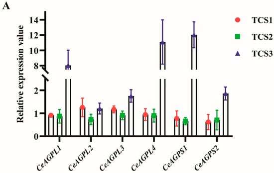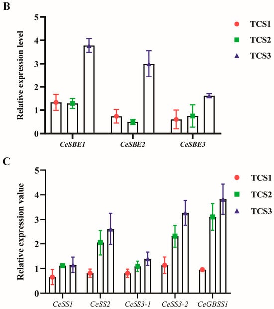 Bar charts illustrate the relative expression levels of differentially expressed genes (DEGs) involved in the starch synthesis metabolic pathway at three distinct developmental stages (TCS1, TCS2, and TCS3) of taro corms (Figure 8). These genes include ADP-glucose pyrophosphorylase genes (CeAGP), starch branching enzyme genes (CeSBE), and genes encoding starch synthases (CeSS1, CeSS2, CeSS3-1, and CeSS3-2) and granule-bound starch synthases (CeGBSS1). The expression levels of these genes were normalized against the β-actin gene as an internal control, reflecting their expression patterns across the developmental stages. For instance, the expression level of the CeSS1 gene may be 1.5-fold that of β-actin at 30 days, increase to 2-fold at 60 days, and potentially decrease to 1-fold at 90 days. These genes exhibit the same pattern as shown in transcriptomic data when tested using qRT-PCR.