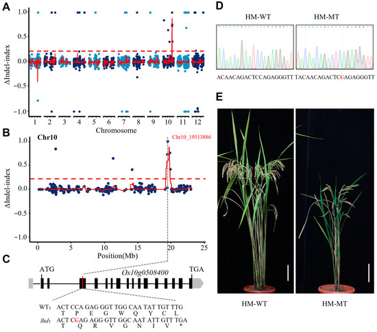 Linkage analysis and candidate gene analysis for the late-heading phenotype in the lhd mutant. (A) Distribution map of the ΔInDel index on 12 rice chromosomes. (B) Distribution map of the ΔInDel index on chromosome 10. The red broken lines in (A,B) represent the average value of the ΔInDel index in the window, calculated by sliding window. The threshold (0.22) is represented by a reddish-brown dotted line and is obtained by calculating the average value of all ΔInDel indices plus three times the standard deviation of all ΔInDel indices. (C) Gene structure of Os10g0508400. The red line indicates the position of the InDel Chr10_19513884 in the gene that caused an amino acid change, leading to premature termination of the protein. UTR and CDS are filled with gray and black, respectively. * represents a stop codon. (D) Original sequencing map confirming the mutation site in the Os10g0508400 gene using the plants from the lhd/WT F3 segregation family population. HM-WT and HM-MT represent the homozygous wild-type genotype and the homozygous mutant genotype, respectively. (E) Comparison of HM-WT and HM-MT plants at the maturity stage. Scale bar = 10 cm.