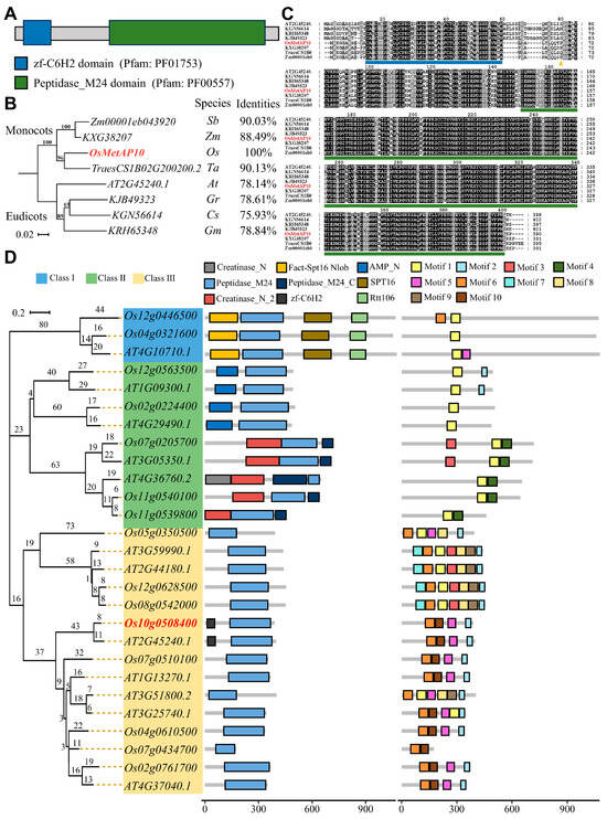 The Os10g0508400 gene was annotated to encode a methionine aminopeptidase. According to the previous naming rules and its location on the chromosome, this gene was named OsMetAP10 [30]. Protein sequence analysis showed that OsMetAP10 encompasses a zf-C6H2 domain at its N-terminal and a peptidase_M24 domain at its C-terminal (Figure 3A). The phylogenetic analysis showed that the OsMetAP10 protein has a high degree of similarity to its homologous proteins in both dicotyledonous and monocotyledonous plants, indicating the high conservation of this protein (Figure 3B,C). The OsMetAP10 gene belongs to the peptidase_M24 superfamily, though few studies previously investigated its gene family and function in rice [22]. By using the peptidase_M24 sequence, we identified 15 putative members containing the peptidase_M24 domain in rice and constructed a neighbor-joining (NJ) phylogenetic tree with 12 peptidase_M24-containing proteins from Arabidopsis (Figure 3D and Figure S3). Based on the combined analysis of motifs and domains, the peptidase_M24 proteins were classified into three subfamilies. The protein sequences of subfamily ΙΙΙ, harboring OsMetAP10, all contained motif 2 and motif 6, indicating that OsMetAP10 belongs to peptidase_M24 protein subfamily III (Figure 3D and Table S3).