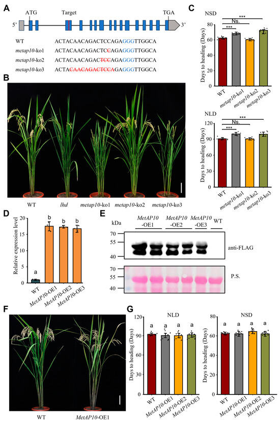 Functional verification of the OsMetAP10 gene. (A) Identification of OsMetAP10 knockout lines generated by CRISPR/Cas9. Blue text indicates the target site of the guide RNA and the protospacer-adjacent motif (PAM). Red letters with a horizontal deletion line represent the deleted bases. (B) Plant phenotypes of wild-type (WT), lhd mutant, and metap 10-ko lines under the NLD condition. Scale bar = 10 cm. (C) Days to flowering of WT and metap 10-ko lines under NLD and NSD conditions. *** Indicates a statistically significant difference: p < 0.001 (Student’s t-test). Ns., no significant difference. (D) Relative expression levels of OsMetAP10 in WT and MetAP10-OE plants. Values are presented as mean ± SD, and different letters indicate significant differences under Duncan’s multiple range test (p < 0.05). Data groups labeled with the same letter show no significant differences, while those labeled with different letters exhibit significant differences at <0.05 statistic level. (E) Expression of MetAP10-Flag protein in WT and MetAP10-OE plants. The upper panel shows the results of Western blot analysis, and the lower panel shows the Ponceau S staining results. (F) Plants of WT and MetAP10-OE1 under the NLD condition. Scale bar = 10 cm. (G) Days to flowering of WT and OsMetAP10 overexpression lines under NLD and NSD conditions. Small letter ‘a’ indicates no significant difference under Duncan’s multiple range test (p > 0.05).