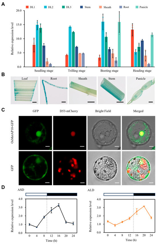 Expression patterns of OsMetAP10. (A) Relative transcription levels of OsMetAP10 in different plant tissues at various development stages under ASD conditions. DL1, the first leaf from the top; DL2, the second leaf from the top; DL3, the third leaf from the top. (B) GUS expression (blue staining) patterns in different tissues of pOsMetAP10::GUS transgenic plants. Scale bar = 2 mm. (C) Subcellular localization of OsMetAP10 in rice protoplasts. As described in the previous literature, D53–mCherry was utilized as a nuclear marker [3,32]. GFP was used as the control. Scale bar = 5 μM. (D) Rhythmic expression pattern of OsMetAP10 in WT under ASD and ALD conditions. The white rectangle indicates the light condition, and the black rectangle indicates the dark condition. The ubiquitin gene was used to normalize gene expression. Each time point represents the mean ± SD of three independent samples.