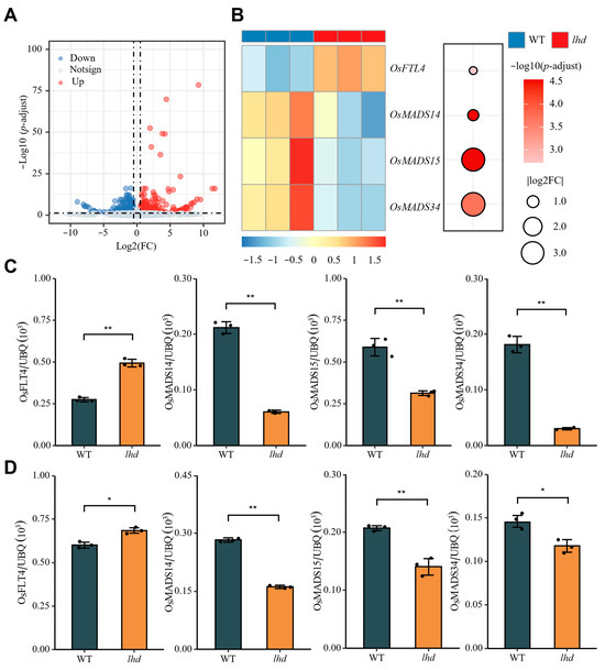 Expression analysis of heading date association genes in lhd mutant and wildtype plants. (A) Volcano plot of differentially expressed genes (threshold: Log2(fold change) > 0.5, p-adjust < 0.05) in the SAMs of WT and lhd under the ALD condition. (B) Expression patterns of OsFTL4 and three flower development-related genes (OsMADS14, OsMADS14, and OsMADS34) in WT and lhd. The left panel shows the expression heatmap of the four genes. The color of bubbles in the right panel represents −log10(p-adjust), and the bubble size indicates the absolute value of Log2(FC). (C,D) Comparison of transcription levels of OsFTL4, OsMADS14, OsMADS15, and OsMADS34 in WT and lhd under ALD (C) and ASD (D) conditions. The ubiquitin gene was used for gene expression normalization. * and ** indicate statistically significant differences with p < 0.05 and p < 0.01 (Student’s t test).